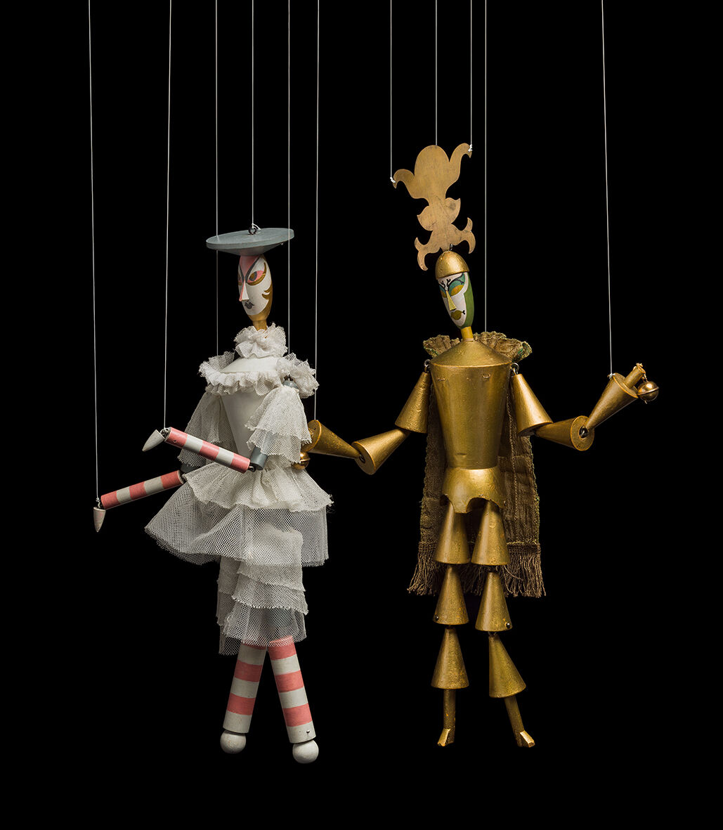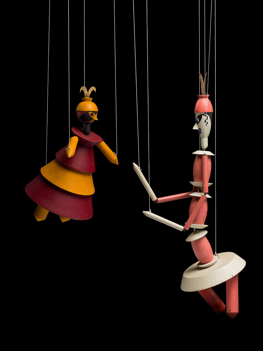 In 1918, on the occasion of a major art exhibition staged in Zurich by the modernist association Schweizer Werkbund, Swiss dramatist René Morax (1873–1963) and director Werner Wolff (1886–1972) produced a modern adaption of Gozzi’s fairy-tale play that turned it into an amusing Dada parody of Sigmund Freud and Carl Gustav Jung’s psychoanalysis, which had caused much controversy in Zurich at the time. The production was conceived as puppetry, for which avant-garde artist Sophie Taeuber-Arp (1889–1943) designed the stage sets and an ensemble of seventeen radically abstracted marionettes. Her designs broke with every tradition of the genre and were influenced by her work in fine and applied art, as well as her experience with expressive dance.