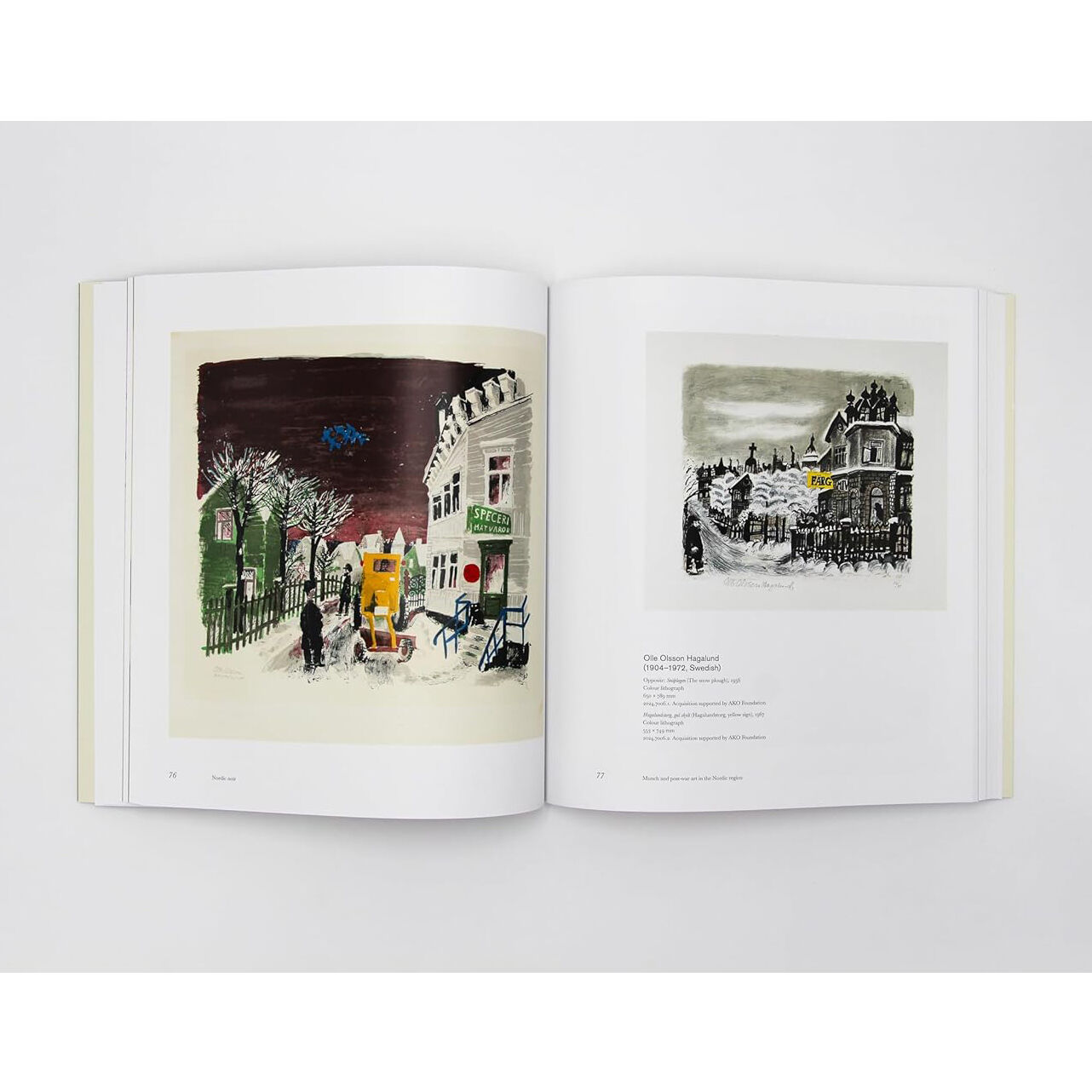 The overwhelmingly spectacular landscape of the region features prominently in many works―dark fjords, vast uninhabited mountain ranges, and heavily forested areas provide a counterpoint to depictions of densely crowded, highly developed urban spaces viewed through the Nordic lens. A growing mood of melancholy and existential angst, emerging from the trauma of the Second World War and the uncertain threat of the Cold War, is often illustrated by a lone, brooding figure. Prints from the 1970s convey a deep criticism of US foreign policy and the Vietnam War but ironically adopt the iconography of American pop art with striking contemporary imagery and bold use of color. The Indigenous Sámi people living in the northern part of Scandinavia and Russia address issues such as their own heritage and identity within the Nordic world. Regional identity is also explored from pride in the artists’ own native countries to coded references to their “Viking” past. The book also features works by contemporary Nordic artists who are constantly challenging the idea of the “perfect” Scandinavian social world often projected by these countries to outsiders.