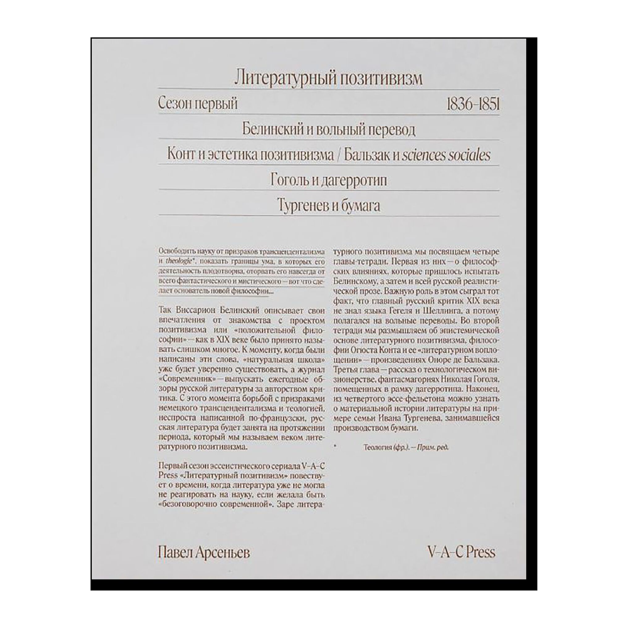 Проект V–A–C Press "Литературный позитивизм" повествует о времени, когда литература уже не могла не реагировать на науку, если желала быть "безоговорочно современной". Вопреки практике издания сборника эссе по следам прочитанных лекций или отдельных публикаций в периодике, жанр настоящего издания можно назвать "разобранными эссе" или — сериалом. Такая мимикрия под материально-техническую историю литературы XIX века, многим обязанную жанру фельетона или критических обзоров за определенный год, представляется более "дружественным пользовательским интерфейсом", чем том, лежащий тяжким грузом на столе читателя.