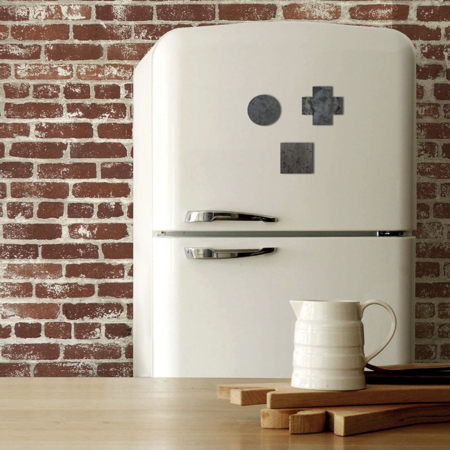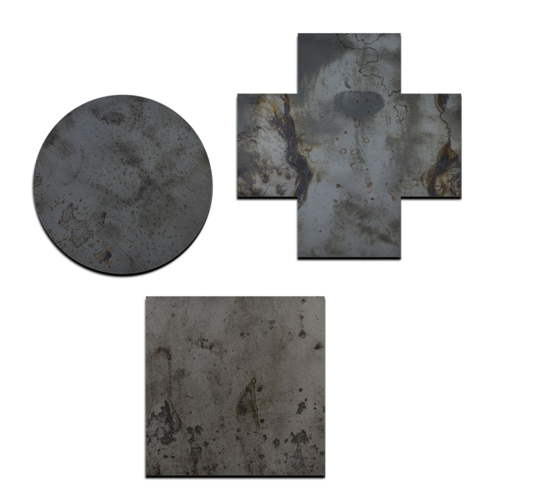 Магниты «Первые фигуры» вырезаны из 3-миллиметрового горячекатанного «чёрного» железа (первый этап, «чёрный»). Металл не имеет защитного покрытия и со временем окислится, обретая по мере коррозии на разных этапах новый цвет (второй этап, «цветной»). Полное разложение фигур, скорее всего, вы не застанете при жизни, металл исчезнет, фигуры растворятся «вслед за цветом» и перейдут в нуль (третий этап, «глубина белого на белом»). Возникнет новый мир — беспредметный.